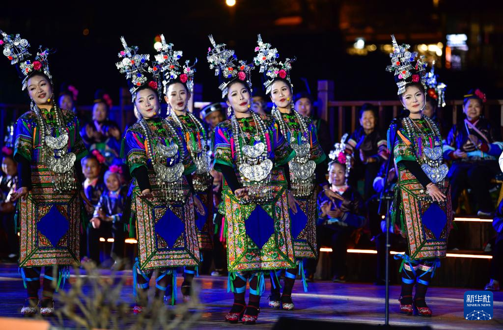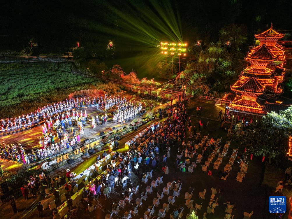 这是3月23日在贵州省黎平县肇兴侗寨拍摄的“大鸾和鸣·天地交响”文化交流专场晚会现场(无人机照片)。