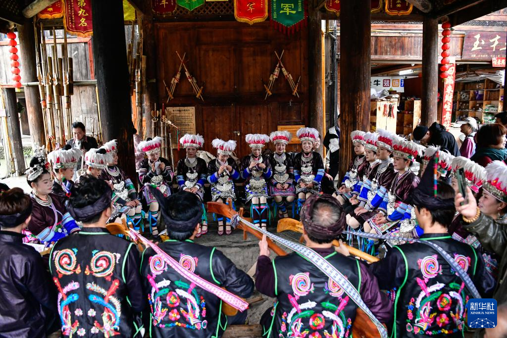 3月23日,侗族青年在贵州省黎平县肇兴侗寨的鼓楼下演唱侗族琵琶歌。
