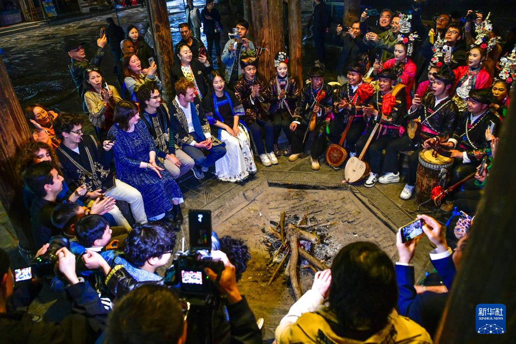 3月23日,在贵州省黎平县肇兴侗寨,美国耶鲁大学威芬普夫斯阿卡贝拉合唱团成员与贵州“村歌”合唱团成员同台演唱歌曲。