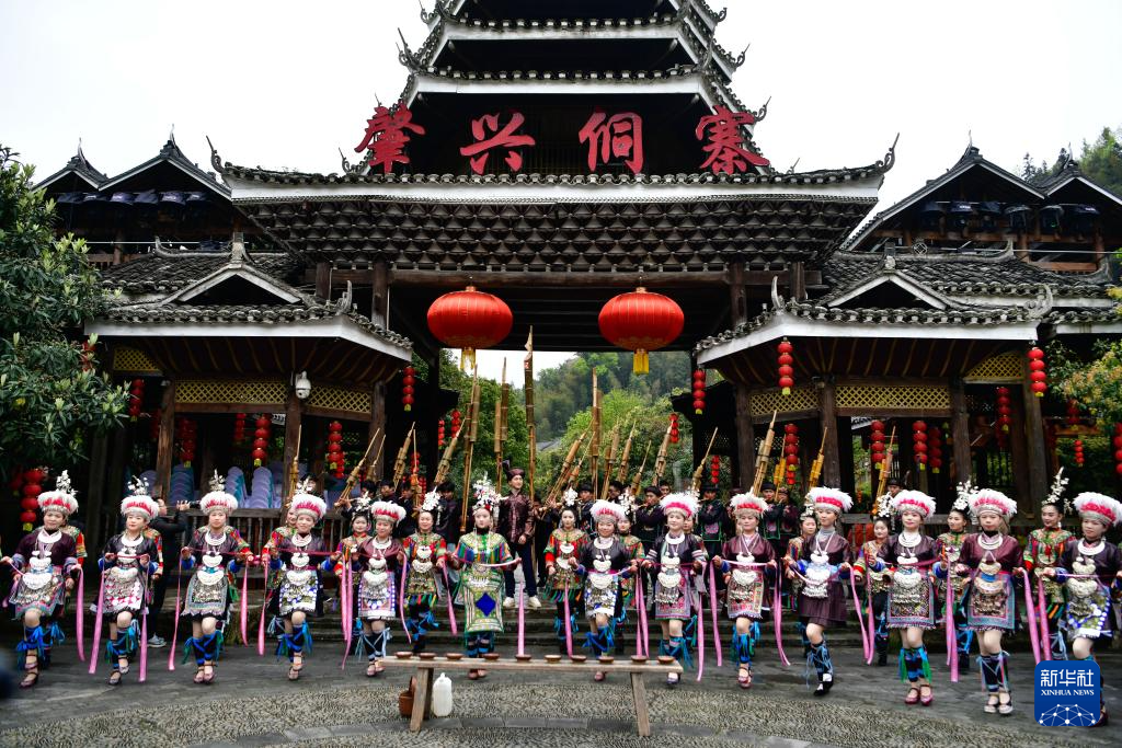 3月23日,侗族群众在贵州省黎平县肇兴侗寨为来宾举办寨门迎宾仪式。