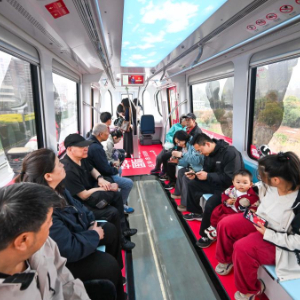 3月23日,游客乘坐空轨列车游览。