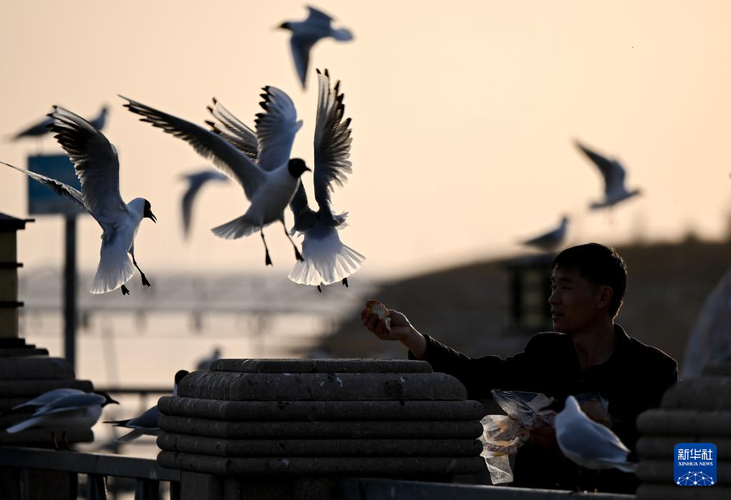 3月25日,游人在乌海市乌海湖岸边给红嘴鸥喂食。