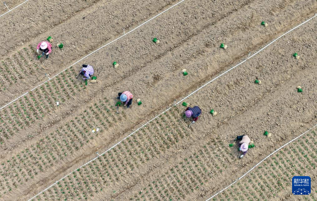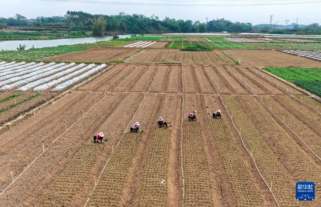 3月24日,广西南宁市邕宁区蒲庙镇农民在田园里种植蔬菜(无人机照片)。