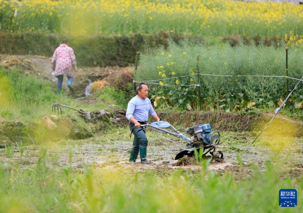 3月24日,在重庆市秀山土家族苗族自治县溶溪镇柳水村,村民操作小型机械在田间犁地。