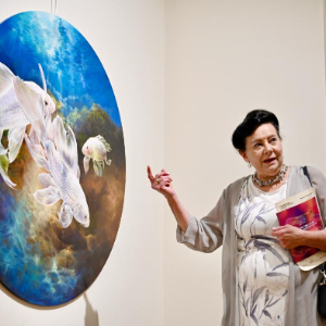 3月25日,在比利时布鲁塞尔,一名比利时艺术家在画展现场介绍自己的画作。