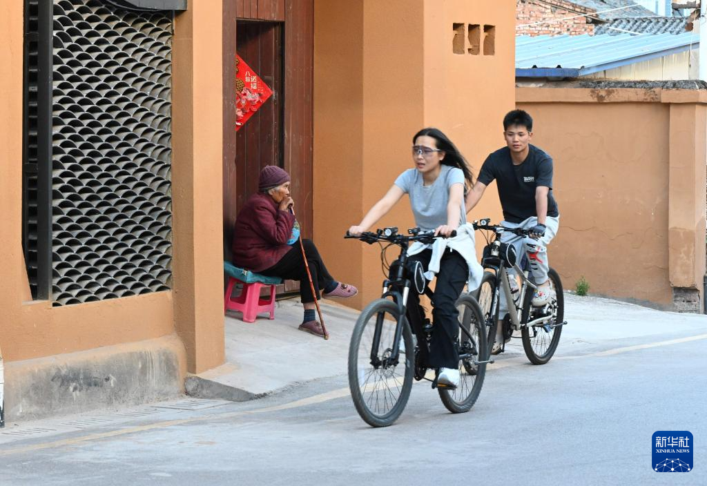 3月26日,东村社区87岁的孙保华老人坐在家门口休息,两名游客骑自行车从她家门口经过。