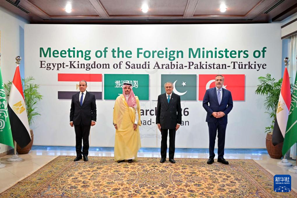 3月29日,在巴基斯坦首都伊斯兰堡,埃及外交部长阿卜杜勒阿提(左一)、沙特阿拉伯外交大臣费萨尔(左二)、巴基斯坦副总理兼外交部长达尔(右二)、土耳其外交部长费丹在会前合影。