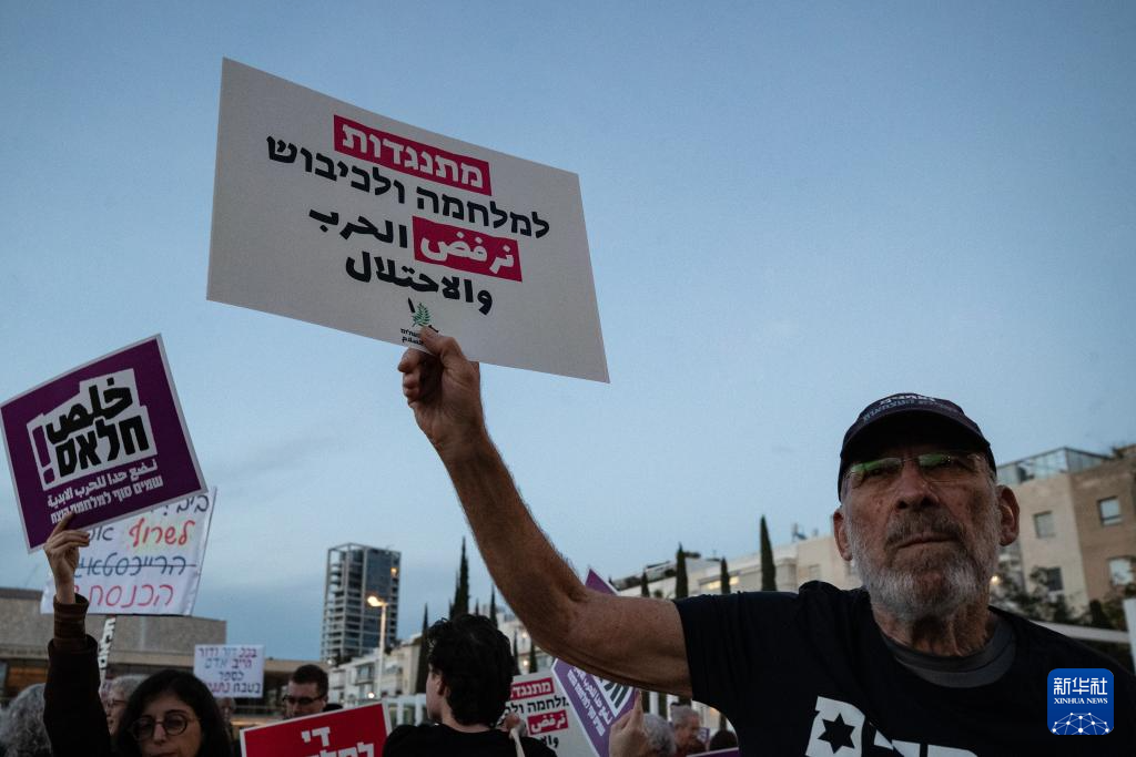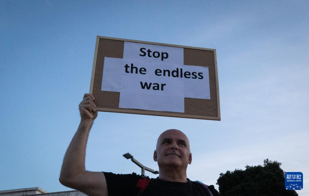 3月28日,在以色列特拉维夫一处广场,一名男子手持标语参加反战集会。
