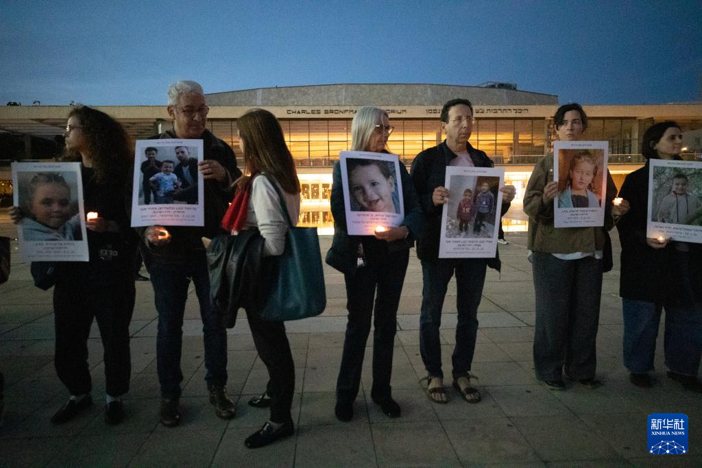 3月28日,在以色列特拉维夫一处广场,人们手持已经身亡的以色列、巴勒斯坦、黎巴嫩、伊朗儿童的画像参加集会。这些孩子在近一个月的战争中死亡。