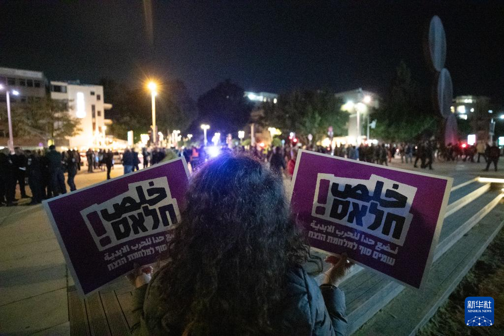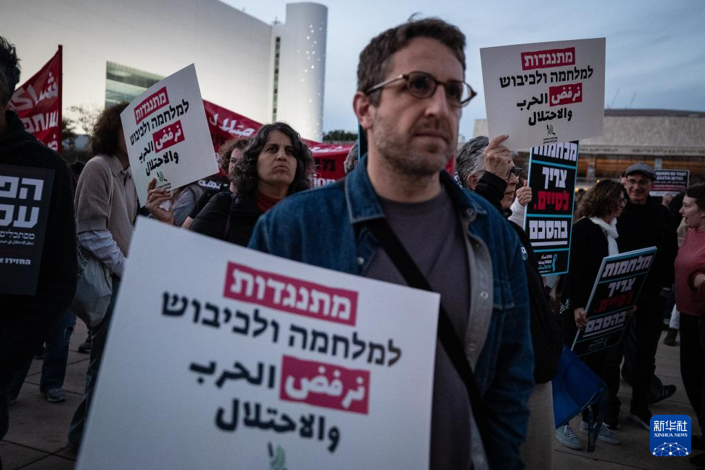3月28日,在以色列特拉维夫一处广场,人们手持标语参加反战集会。