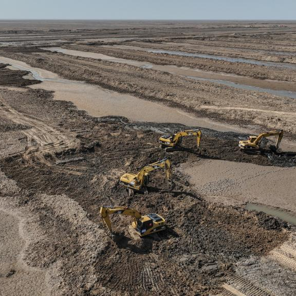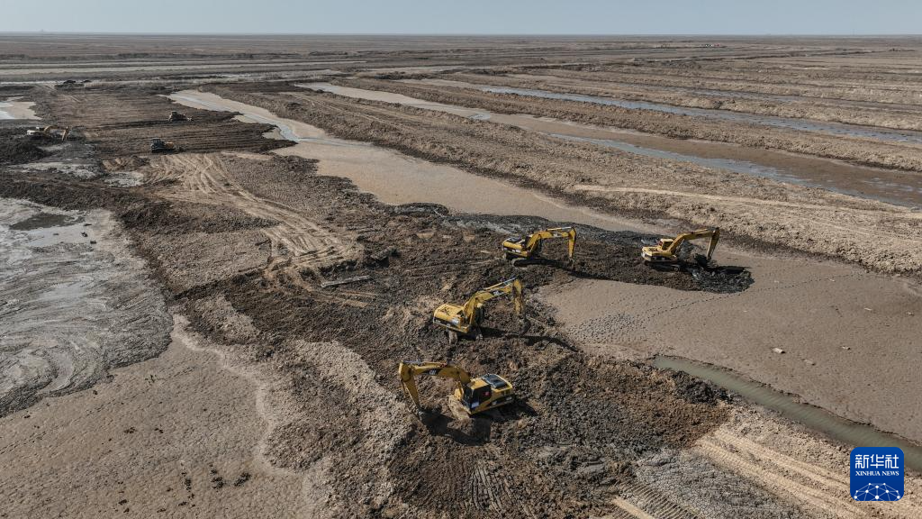 春日,在辽宁辽河口国家级自然保护区内,数台大型机械有序开展地形修复作业。这里是盘锦市海洋生态保护修复工程项目的施工现场。