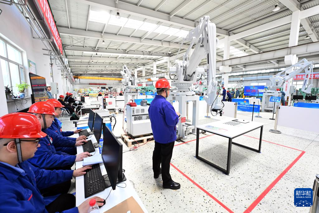 4月1日,参赛选手进行工业机器人视觉协同编程调试项目比赛。