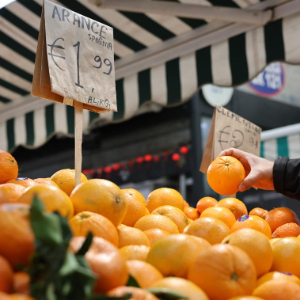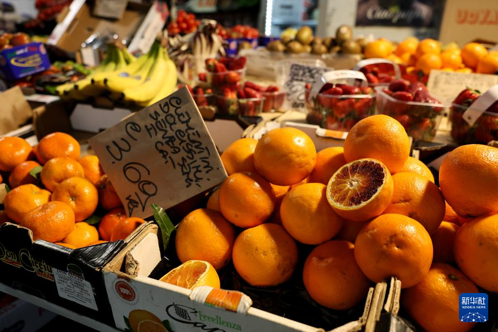 这是3月31日在意大利罗马一处菜市场拍摄的水果摊。