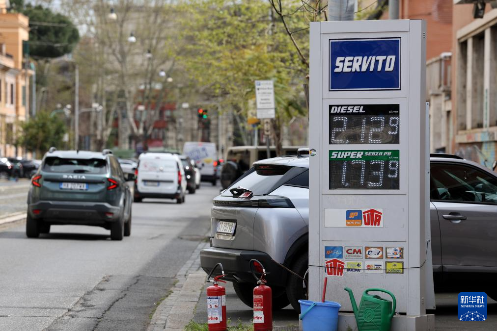 这是3月31日在意大利罗马一处加油站拍摄的油价牌。