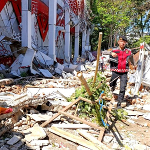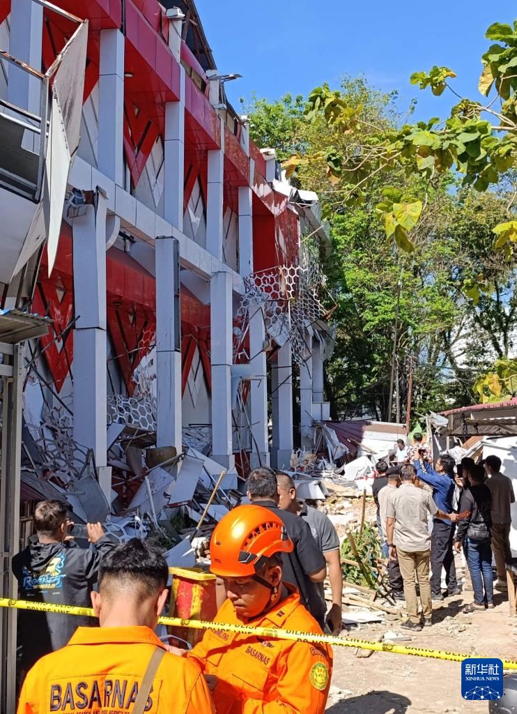 4月2日,在印度尼西亚北苏拉威西省万鸦老,救援人员在一座受损建筑旁工作。