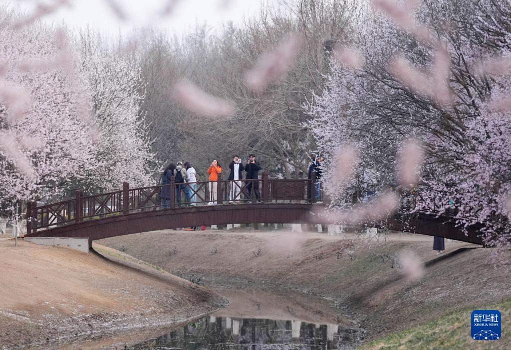 3月23日,游客在北京奥林匹克森林公园北园观赏桃花。