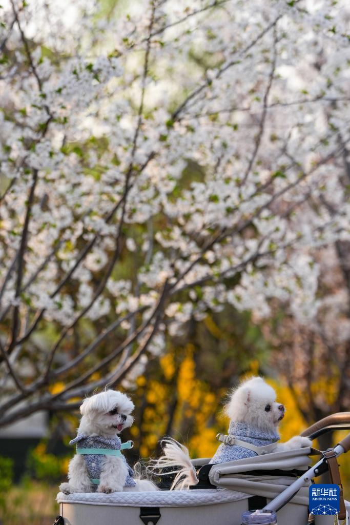 在北京朝阳区亮马河国际风情水岸拍摄的樱花树下的两只小狗(4月1日摄)。