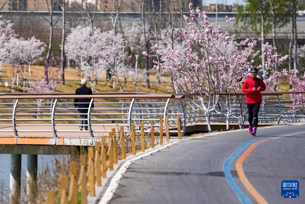 市民在鲜花盛开的北京市坝河岸边跑步锻炼(4月1日摄)。
