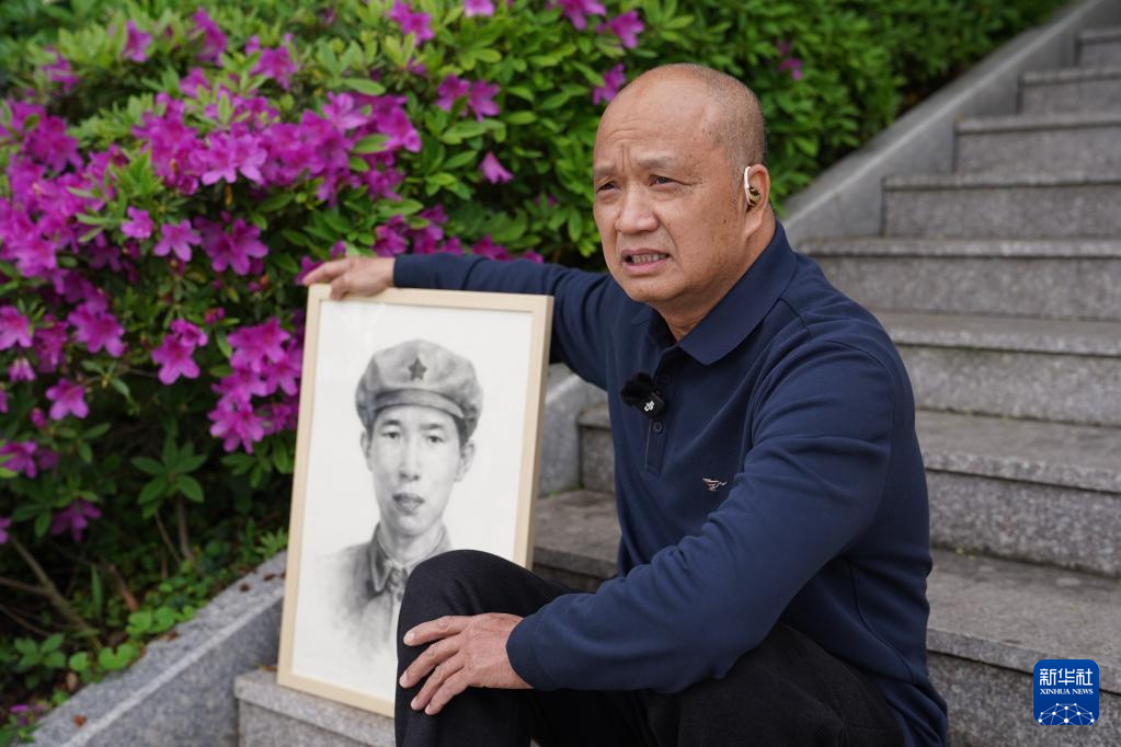 红军烈士钟延柱的后代钟浪在爷爷的画像边讲述烈士生平(4月1日摄)。