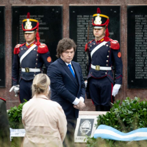 4月2日,阿根廷总统米莱(中)在阿根廷布宜诺斯艾利斯参加纪念马尔维纳斯群岛战争活动。