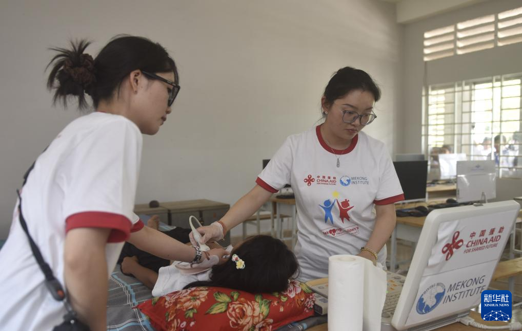 4月2日,医生在柬埔寨贡布一所小学为学生做心脏超声检查。