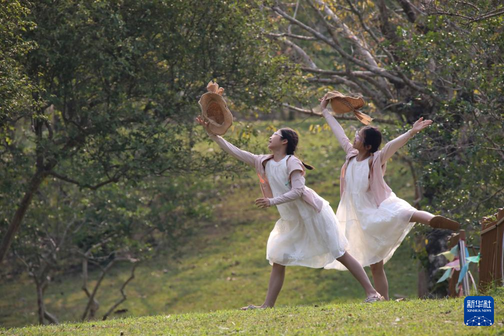 4月4日,两名学生在云南省勐腊县中国科学院西双版纳热带植物园内玩耍。