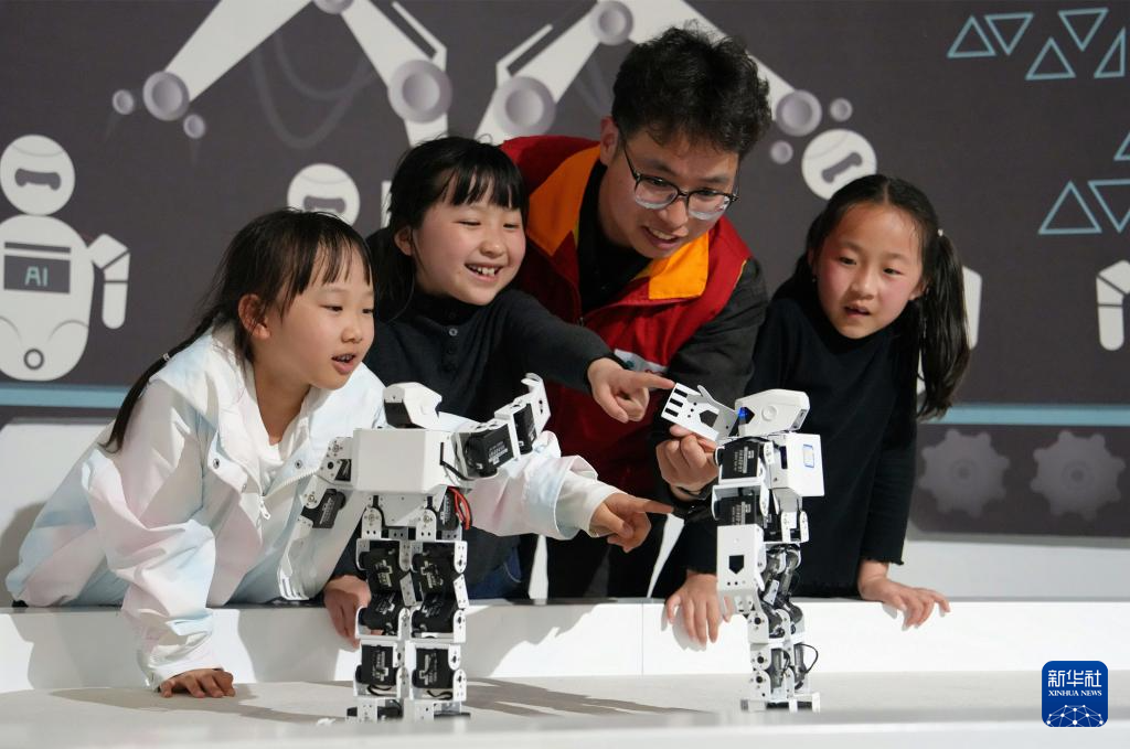 4月2日,志愿者带托管班孩子在江苏省海安市科技馆观看机器人表演。