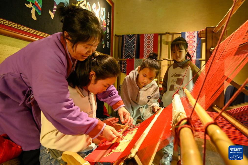 4月3日,重庆市酉阳土家族苗族自治县桃花源景区非遗织锦工坊,小朋友们在非遗传承人的指导下学习土家织锦纺织技艺。
