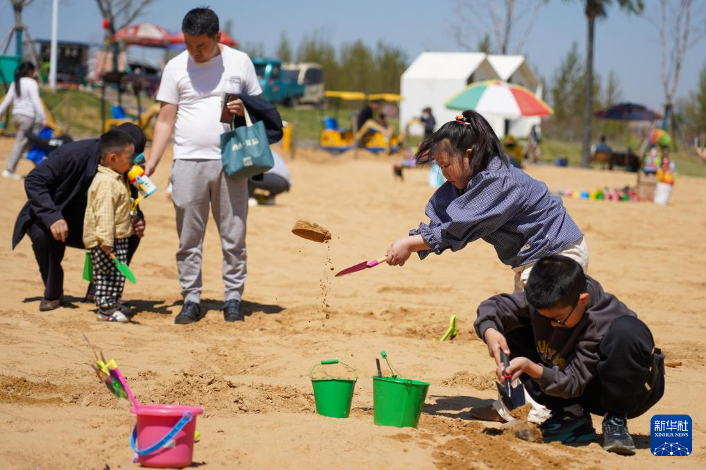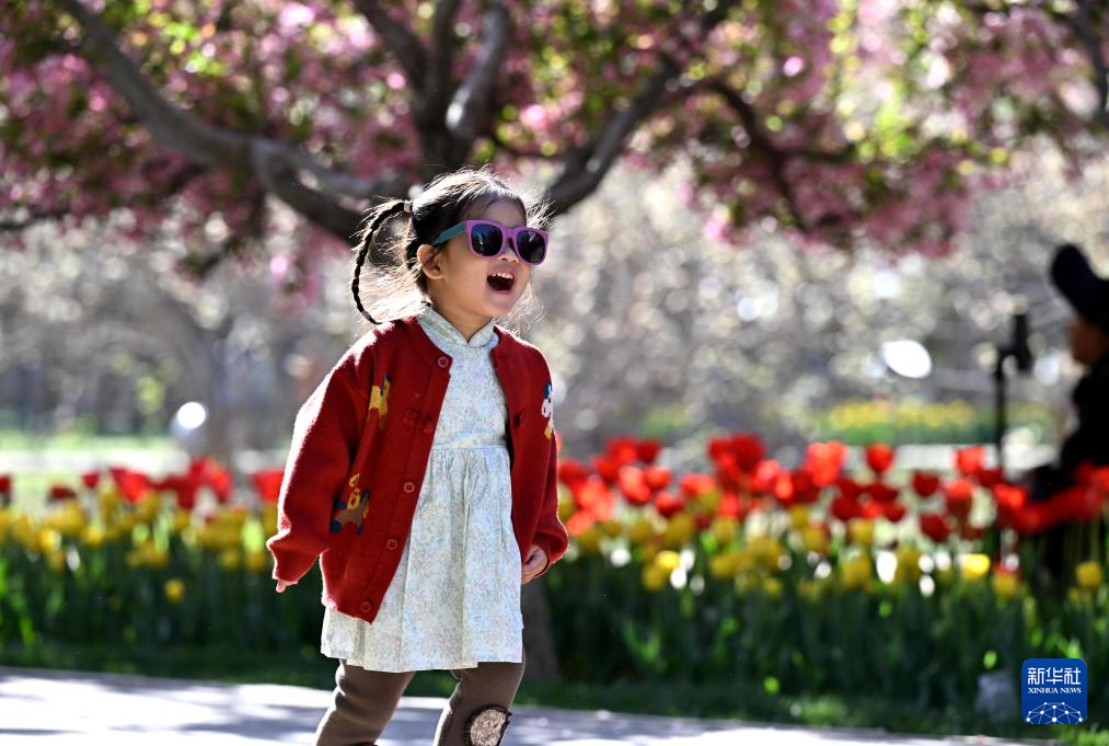4月4日,小游客在河北省石家庄市植物园游玩。