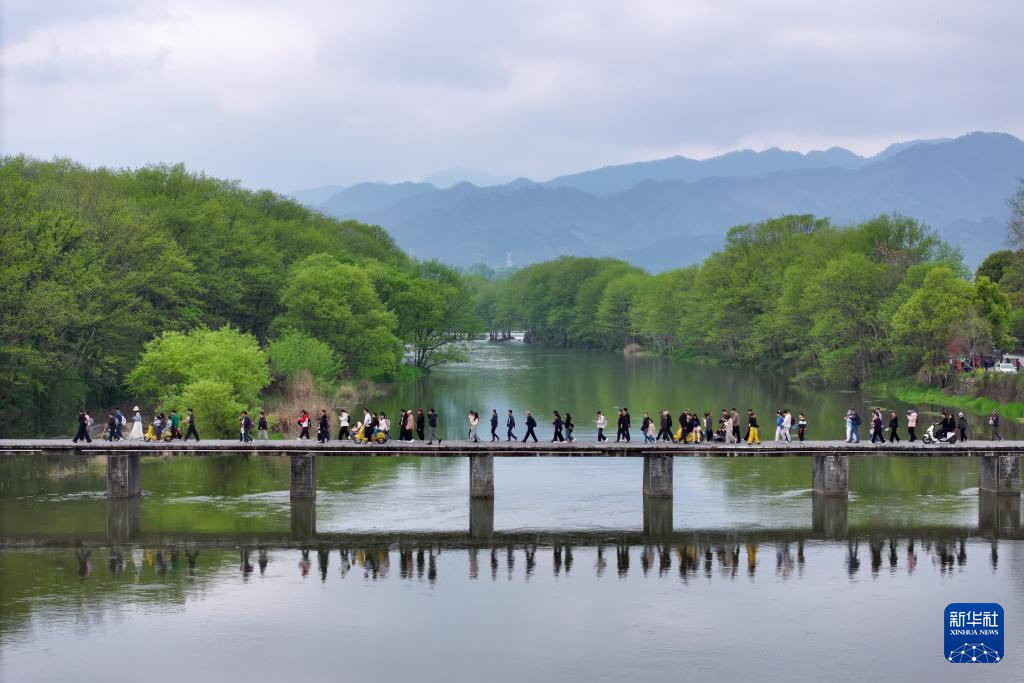 4月4日,游客在安徽省黄山市徽州区西溪南湿地踏青游玩(无人机照片)。