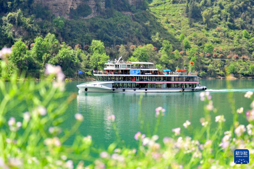 4月4日,在湖北省宜昌市夷陵区乐天溪镇境内的长江西陵峡水域,游客乘坐“长江三峡”7号游船游览峡江春景。