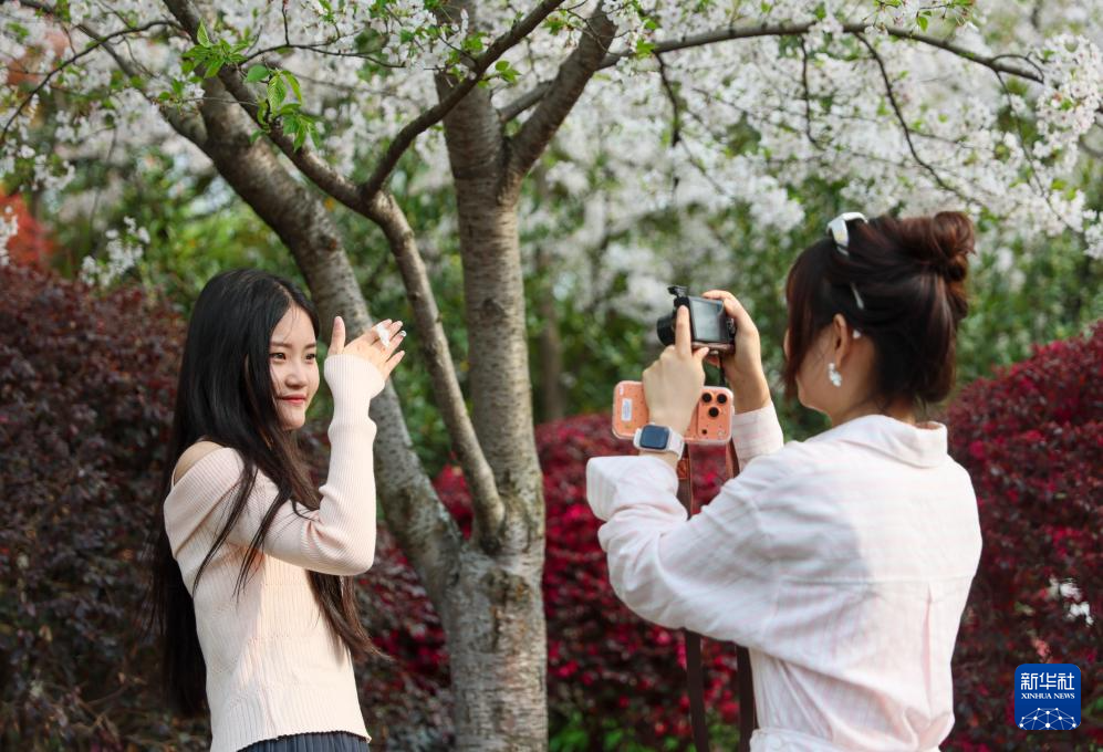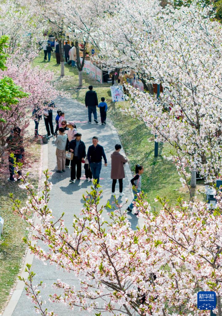 4月4日,游客在河南省洛阳市隋唐城遗址植物园内赏花。