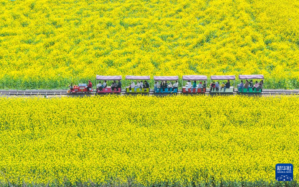 4月4日,游客在江苏省淮安市盱眙县黄花塘镇向阳花海乘坐小火车游玩(无人机照片)。