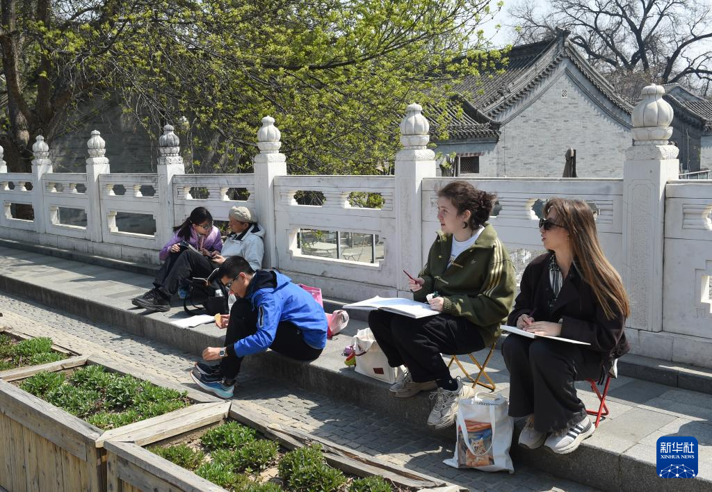 4月4日,在河南省焦作市博爱县人民公园,小朋友在写生。