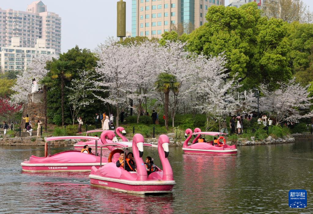4月4日,游客在江苏省高邮市湖上花海景区乘船游玩(无人机照片)。