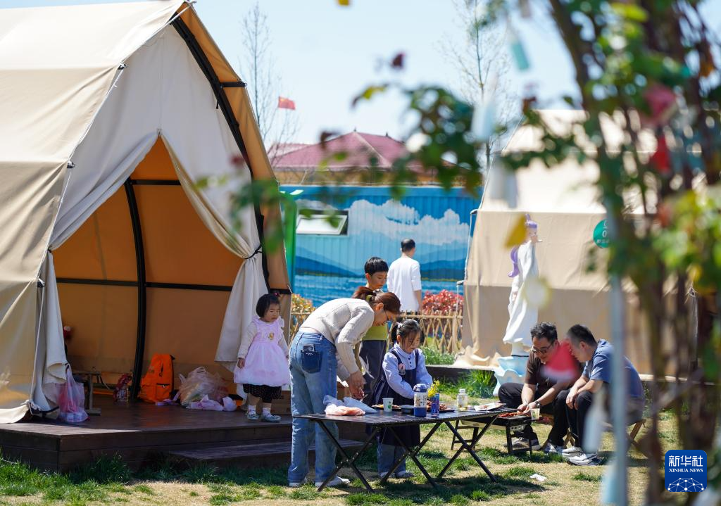 4月4日,游客在山东省滕州市龙阳镇“龙湖月色”省级乡村振兴齐鲁样板片区内露营休闲。