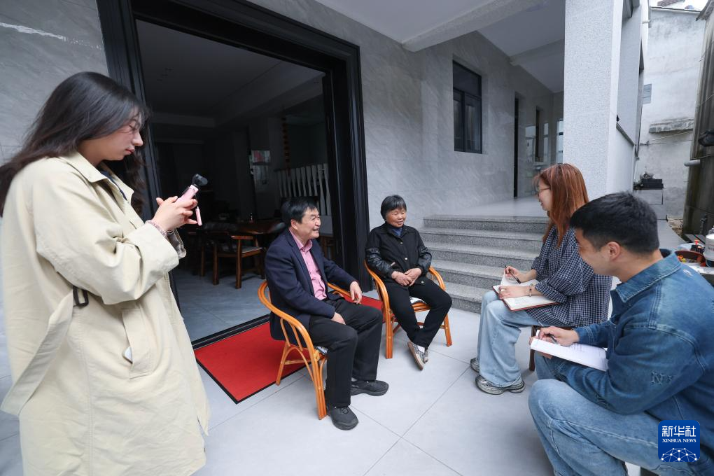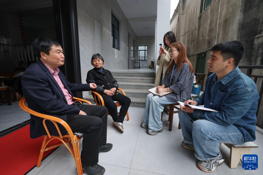 4月4日,冯贝贝(右二)和周烨(右一)在十里坪村党总支书记卓任翔(左二)的带领下走访村民,了解民生保障服务相关事项,郦泱泱(左一)拍摄视频素材。