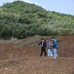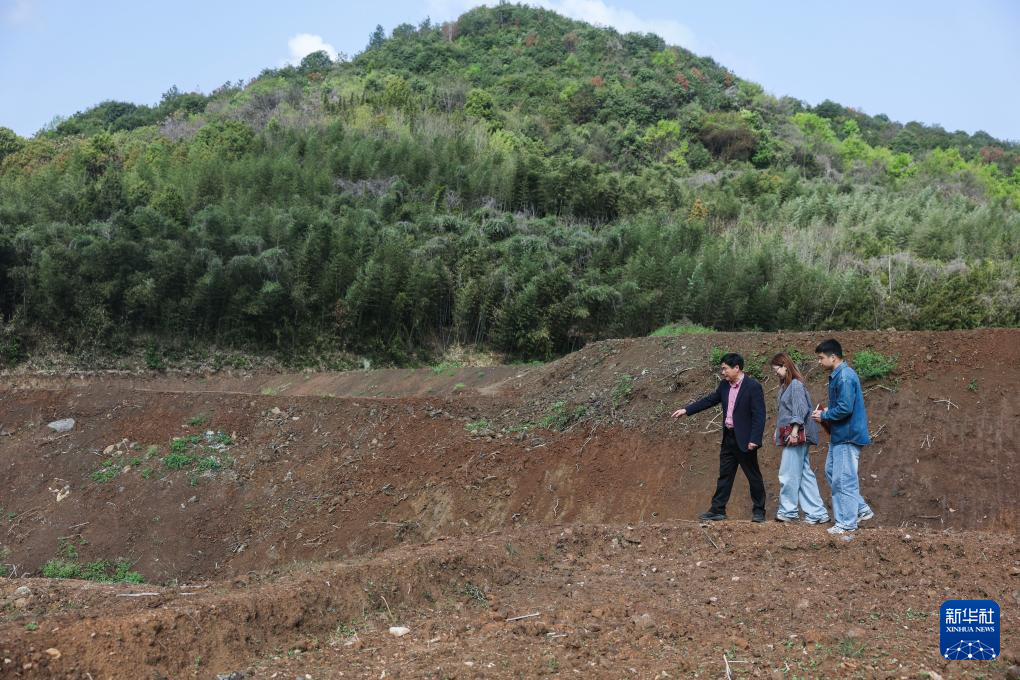 4月4日,十里坪村党总支书记卓任翔(中)带领郦泱泱、冯贝贝、周烨踏勘春耕备耕现场以及农用设施建设进度。
