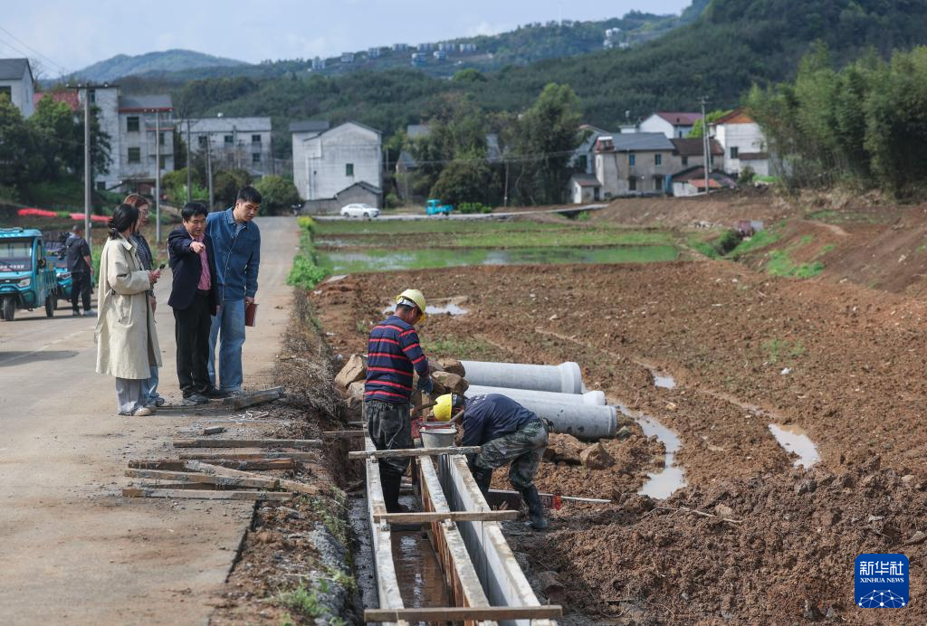 4月4日,十里坪村党总支书记卓任翔(左一)带领冯贝贝、周烨踏勘春耕备耕现场以及农用设施建设进度。