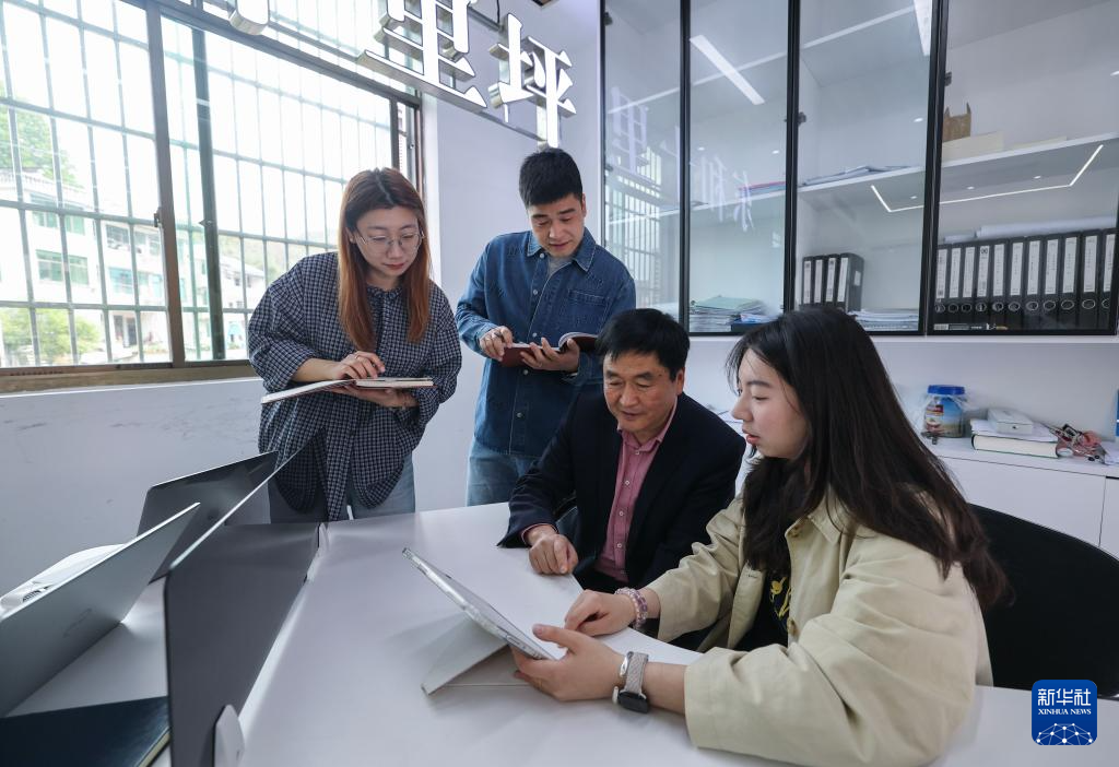 4月4日,郦泱泱(右一)、冯贝贝(左一)、周烨(左二)与十里坪村党总支书记卓任翔(右二)进行座谈,商讨最新的短视频拍摄主题。