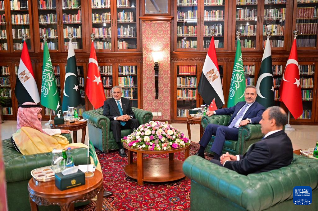 3月29日,在巴基斯坦首都伊斯兰堡,沙特阿拉伯外交大臣费萨尔(左一)、巴基斯坦副总理兼外交部长达尔(左二)、土耳其外交部长费丹(右二)、埃及外交部长阿卜杜勒阿提举行会谈。