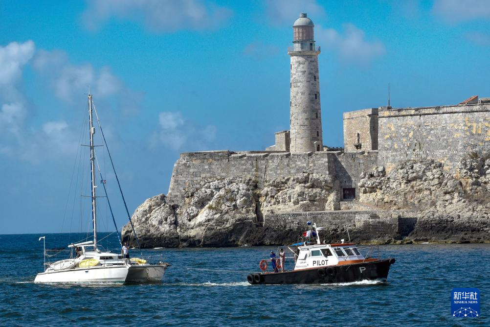 3月28日,一艘向古巴运送人道主义援助物资的船只(左)在引航船的指引下驶入哈瓦那港。