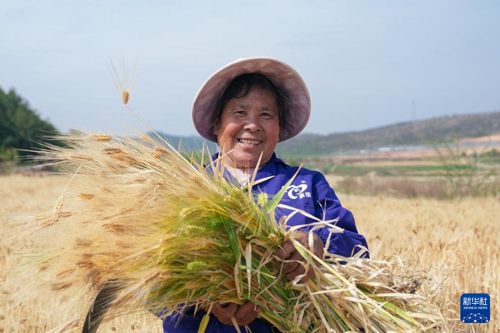 4月5日,农民在云南省曲靖市陆良县小百户镇常旗堡村田间收割大麦。
