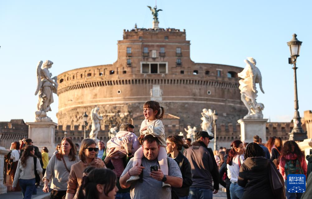 4月3日,游客在意大利首都罗马圣天使城堡前的圣天使桥上参观游览。