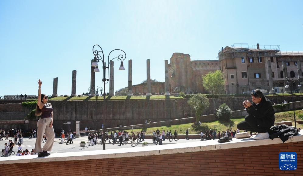 4月4日,游客在意大利首都罗马的古罗马广场附近留影。