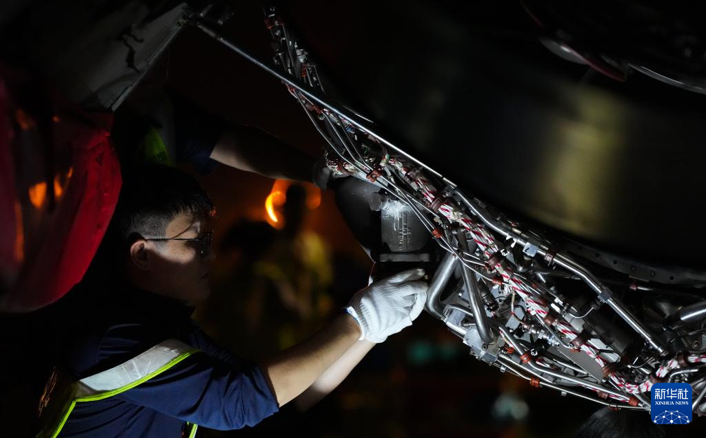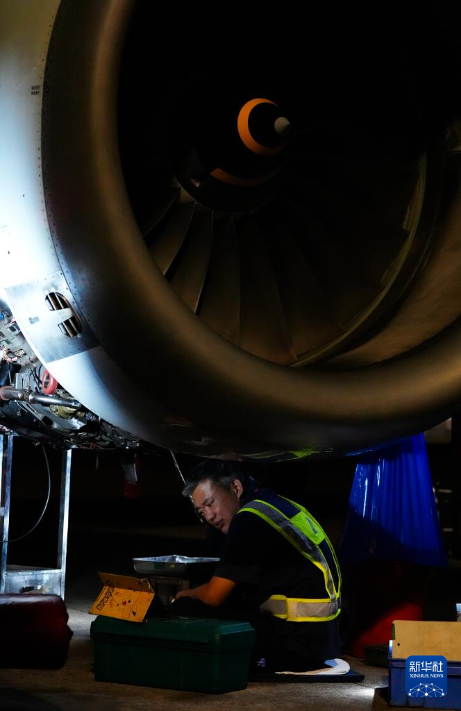 在海口美兰国际机场停机坪上,南航工程技术分公司机务工程师对“消博号”彩绘飞机进行深度检查(4月4日摄)。
