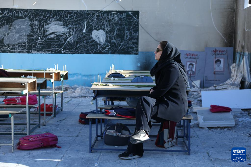 4月6日,在伊朗首都德黑兰市举行的悼念活动现场,组织者搭建起小学教室遭袭场景并在课桌上摆放书包,悼念遭美以空袭遇难的米纳卜小学学生。