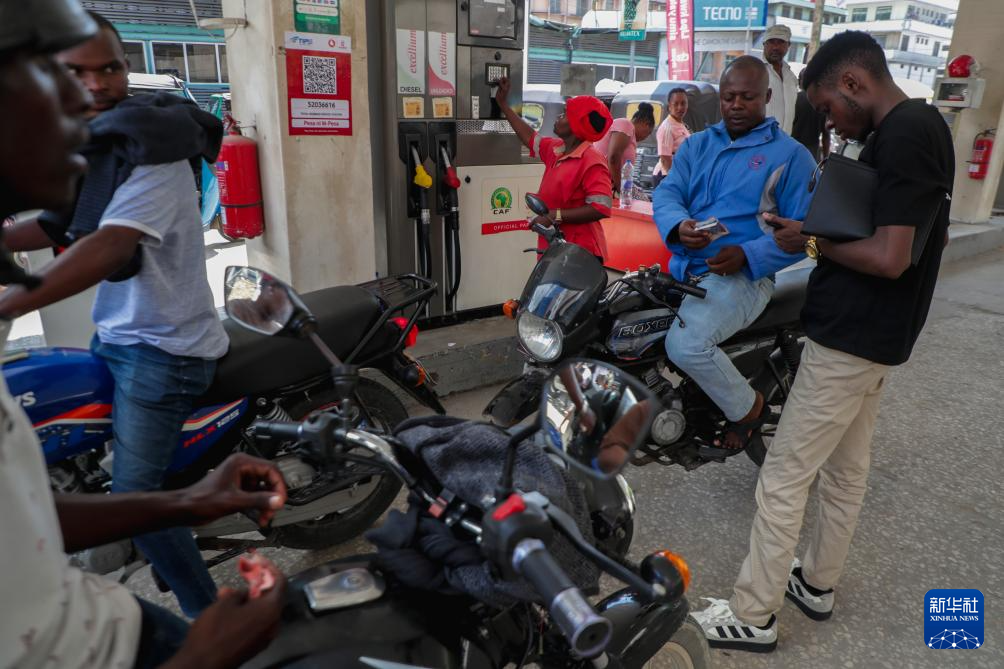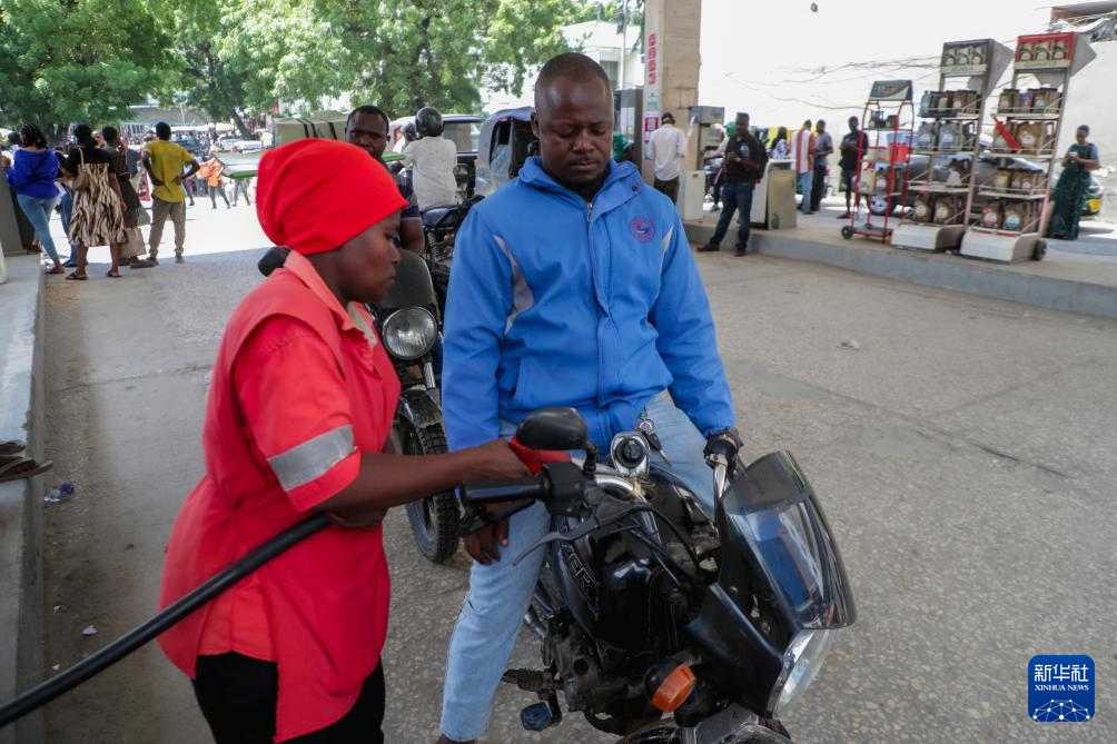 4月4日,摩托车主在坦桑尼亚达累斯萨拉姆一处加油站加油后付款。