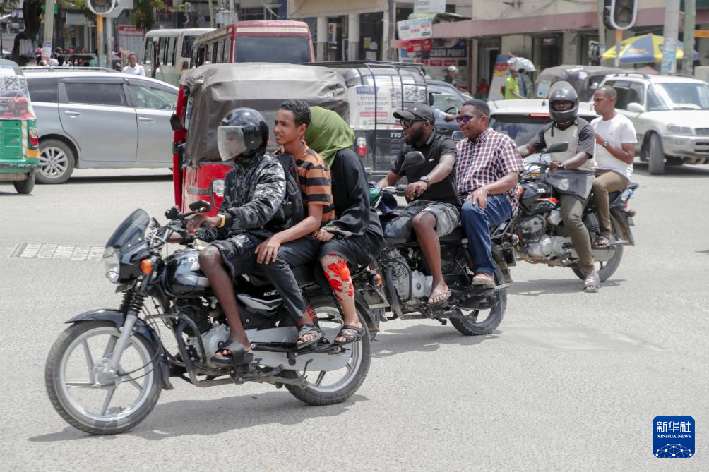 4月4日,在坦桑尼亚达累斯萨拉姆街头,人们乘摩托车出行。