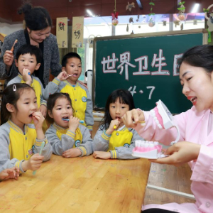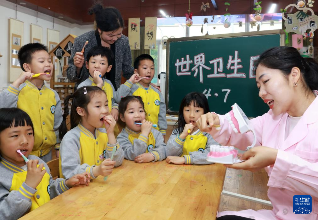 4月7日,浙江省湖州市德清县中心幼儿园小朋友在老师指导下学习正确刷牙方法。